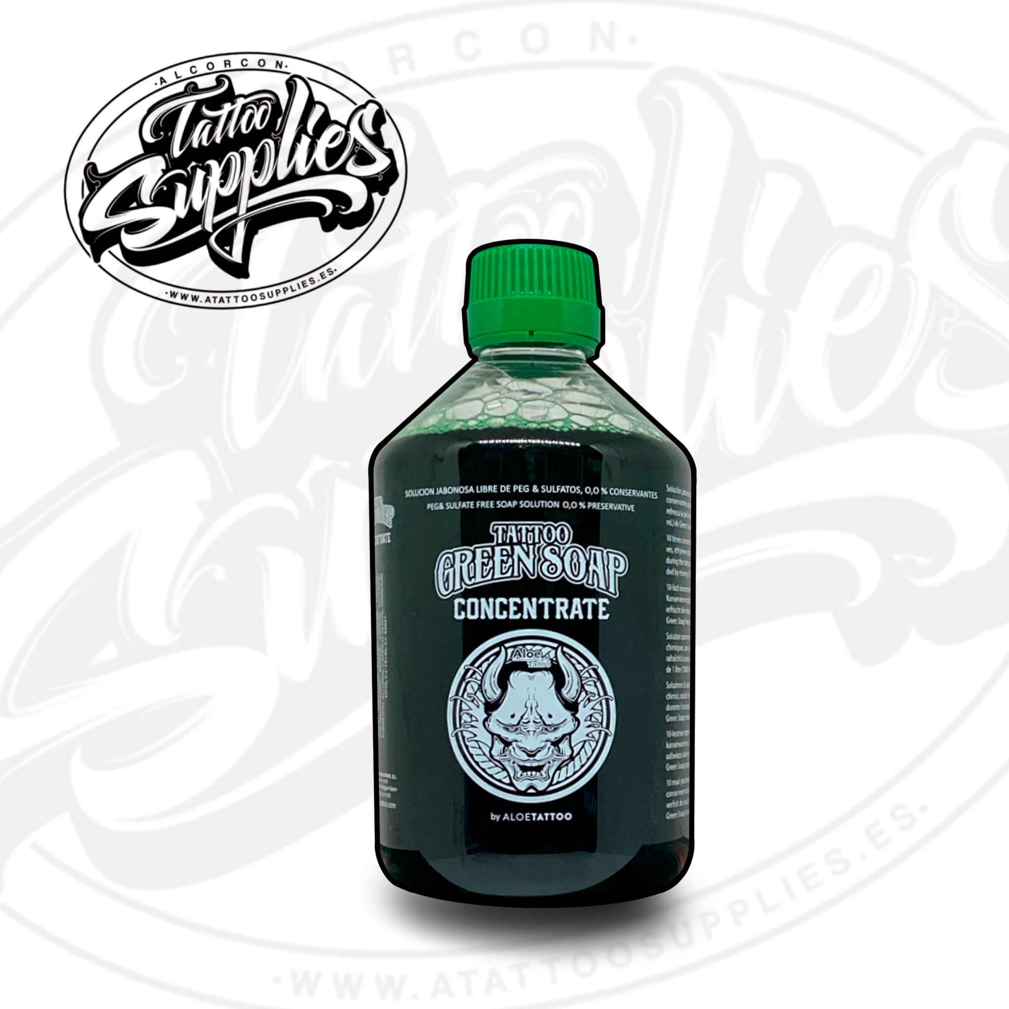 -Mezclar 4,5 litros de agua destilada con una botella de Green Soap Concentrate AloeTattoo .