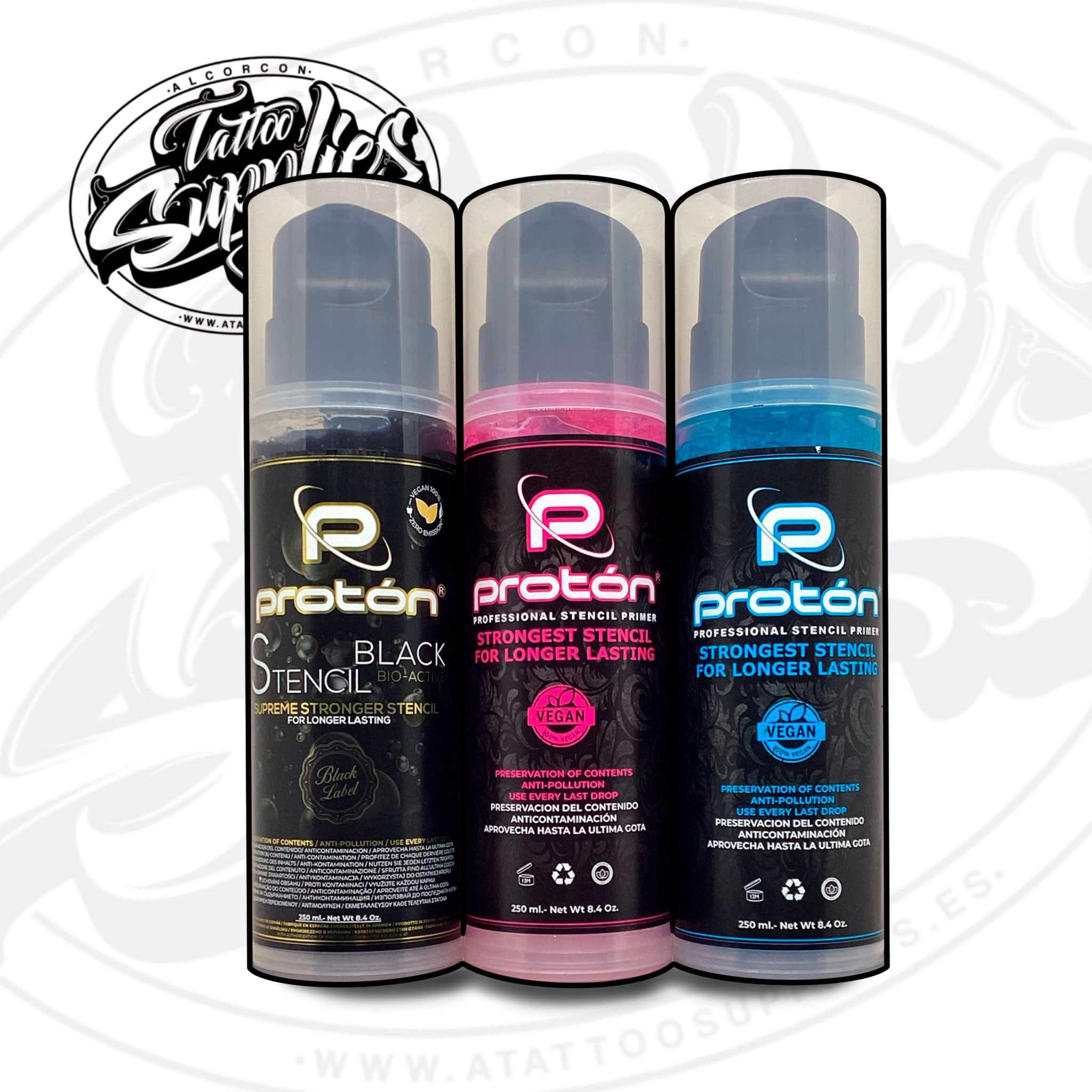 Proton Professional Stencil Primer surgió en Medellin (Colombia) por un grupo de artistas intentando mejorar lo ya existente viendo que las plantillas de tatuajes se les borraban de la piel, dando como resultado Proton Professional Stencil Primer, el Stencil mas fuerte creado jamás y testado en miles de pieles, con una formulación única y una duración de mas de 15 horas en la piel.